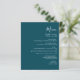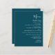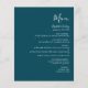 Este sencillo y moderno menú boda presenta textos blancos sobre un fondo azul verde azulado oscuro. La palabra "Menú" aparece en caligrafía elegante de escritura a mano. Agregue el nombre de la pareja y la fecha del boda en guiones y cursiva, junto con el detalle del menú en letra sans serif. El reverso es un tono de verde azulado sólido.