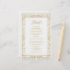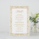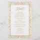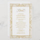 El menú boda incluye un marco geométrico antiguo dorado, un fondo blanco roto y un elegante guión de oro antiguo.