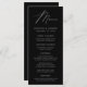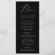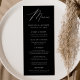 Menú de bodas sencillo y elegante con "Menú" presentado en un guión blanco moderno con fondo negro y sutiles puntas blancas. Personalice el menú boda negro agregando nombres, fecha de boda e información de menú. Diseñado para coordinar con nuestra colección de bodas Modern Elegance.