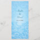 El patinaje floral hace de esta bonita carta de boda azul un aspecto único. La imagen se repite en la parte inferior como una marca de agua para compensar el texto del menú boda personalizado. Toda la imagen se repite al revés de manera opuesta y se puede añadir o quitar texto encima de ella. Un estilo elegante y clásico para un día especial. Disponible en colores alternativos con productos coincidentes. com.
