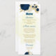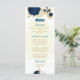 Flores románticas azul marino y blancas con hojas de oro tarjeta de menú botánico boda. Los detalles del purpurina se simulan.
