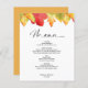 Celebra tu boda de otoño con estilo sin comprometer tu presupuesto con este menú Boda de Saltos del Presupuesto. Con encantadores ilustraciones de follaje otoñal de tonos cálidos, el diseño de esta carta refleja la acogedora belleza rústica de la temporada mientras que ofrece una manera asequible de elevar las mesas de recepción. El diseño, de fácil lectura, ofrece una lista elegante de cada plato, añadiendo un toque de atención que guía a los clientes a lo largo de la experiencia culinaria. Es la solución perfecta para las parejas que buscan crear una apariencia coherente y estacional sin gastar demasiado.