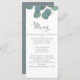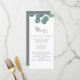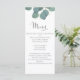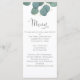 Hermosa y suculenta carta de menú del boda de follaje eucalipto. con escritura caligráfica, vegetación sencilla de eucalipto y follaje verde, perfecta para la decoración de la recepción nupcial