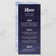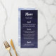 Este menú de bodas de noche es perfecto para una noche bajo las estrellas. El menú azul marino se puede personalizar para incluir los nombres de la pareja y la fecha boda, junto con tres platos. En la parte trasera del menú encontrarás un lavabo de acuarela azul claro.