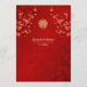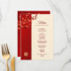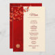 Flores de cerezo rojas y un símbolo de doble felicidad dorado sobre un fondo rojo brillante. Con nombres de novias y novios personalizados, la fecha del boda y un texto de menú personalizado.