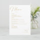 Eleva tu recepción de bodas con nuestro elegante menú Boda con manto dorada. Esta exquisita carta cuenta con un lujoso guión con letras de acento dorado que le aporta un toque sofisticado a su día especial. El diseño muestra la palabra "Menú" en un guión fino y refinado en la parte superior izquierda, complementado con un estilo clásico de suero estilo antiguo con acento dorado para los detalles del menú, asegurando que las selecciones seleccionadas sean legibles y elegantes. En la parte inferior derecha, los nombres de sus parejas personalizadas se muestran en una pantalla extravagante tipo serif, perfectamente emparejada con el guión escrito a mano "Enjoy!". El fondo blanco resplandeciente aporta un lienzo limpio que permite brillar los acentos dorados. Con una distribución vertical de 5"x7", esta tarjeta de menú sirve como elemento funcional y como conservador apreciado, reflejando su estilo único. Ya sea que esté organizando un evento formal o una celebración más relajada, esta carta de menú mejorará su experiencia gastronómica con su toque de elegancia. Haz que tu boda sea inolvidable con una carta de menú tan especial como tu historia de amor. Personalice el suyo hoy mismo para añadir un toque hermoso e inolvidable a su evento.