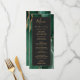 Este elegante y moderno menú boda presenta una decoración de color verde esmeralda. El texto del personalizable combina un guión de escritura manual caprichosa de color dorado con fuentes cursivas y de copperplate en un fondo negro de pizarra. El reverso presenta un diseño de ágata dorado y verde esmeralda a juego.