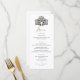 Un único ilustracion de granero con luces de cuerdas amarillas y calabazas. Se trata de un elegante diseño rústico con caligrafía moderna y fuentes. Los nombres de la pareja y la fecha especial están abajo. En la parte trasera hay un código QR para un menú de bebidas y cócteles exclusivos.