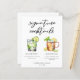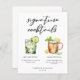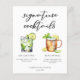 En esta hoja de menú de cócteles de moda de alto nivel se presenta una tipografía negra simple sobre 2 bebidas y sus ingredientes para el bar boda. Un bonito dibujo de Gin y Tonic y Moscova le dan un toque fresco a su menú de bar. Con los nombres de la pareja y la fecha de recepción.