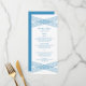 Carta de Boda moderna sencilla y elegante con un diseño Art Deco de rayas cruzadas en azul. Esta tarjeta de menú clásica se puede personalizar fácilmente con los detalles de su boda. Para obtener más opciones de personalización, haga clic en el botón Personalizar.