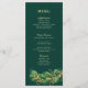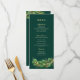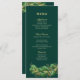 Estos elegantes menús de boda verde esmeralda y dorado están decorados con ilustraciones de eucalipto. Escriba sus nombres, fecha y cursos para crear menús de boda elegantes para el boda con estilo de joyería.