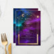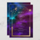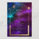 Las tarjetas del Boda Espacial Cosmic Purple Verde azulada Gold Moon Stars cuentan con un sol dorado, luna y estrellas enmarcadas en un colorido fondo cósmico místico morado, verde azulado y azul, con los detalles del menú en el centro en un guión moderno de caligrafía dorada. Personalice editando el texto en los cuadros de texto proporcionados. Diseñado por Evco Studio © en www.zazzle.com/store/evcostudio
