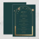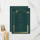 Micstical Green Gold Sun Moon Stars Astronomía Galaxy Celestial Cosmic Space Boda Cartas de menú con un sol dorado, luna y estrellas enmarcadas en un fondo verde con los detalles del menú en el centro en un guión moderno de caligrafía dorada. Personalice editando el texto en los cuadros de texto proporcionados. Diseñado para usted por ©2022 Evco Studio en www.zazzle.com/store/evcostudio