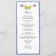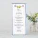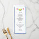 Tarjeta de menú de tema Amalfi elegante que incluye frutas y flores pintadas a mano comunes en jardines mediterráneos con borde azul. Perfecta para boda de destino italiano