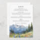 Estos modernos menús de bodas de flores silvestres de las montañas acuáticas se pueden personalizar con su información en tipografía moderna. Diseñado por Thisisnotme©