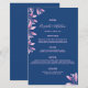 Carta boda florida, elegante y de moda. Personalice y agregue sus nombres, fecha y el menú boda. Fondo azul decorado con estribos botánicos y follaje rosa. Sus nombres están escritos con un guión moderno de estilo con letras a mano. Fondo azul.