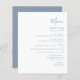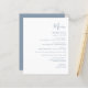 Este sencillo y moderno menú boda presenta un polvoriento texto azul sobre un fondo blanco. La palabra "Menú" aparece en caligrafía elegante de escritura a mano. Agregue el nombre de la pareja y la fecha del boda en guiones y cursiva, junto con el detalle del menú en letra sans serif. El reverso es un tono de azul sólido y polvoriento.