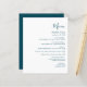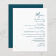 Este sencillo y moderno menú boda presenta un verde azulado texto azul sobre un fondo blanco. La palabra "Menú" aparece en caligrafía elegante de escritura a mano. Agregue el nombre de la pareja y la fecha del boda en guiones y cursiva, junto con el detalle del menú en letra sans serif. El reverso es un tono de verde azulado sólido.