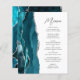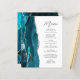 En el extremo izquierdo de este elegante y moderno menú boda, un verde azulado diseño de agate color azul acuático adornado con un falso purpurina plateado. El texto del personalizable combina el guión de escritura a mano gris carbón y sans serif en un fondo blanco. El diseño del ágate verde azulado y plateado se repite al revés.