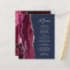 En el extremo izquierdo de este elegante y moderno menú boda, se sirve un diseño de batidos de color burdeos adornados con falsos purpurinas de plata. El texto del personalizable combina el guión de escritura a mano gris plateado y las fuentes sans serif en un fondo azul marino. El diseño de agate de color burdeos y plata se repite al revés.