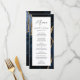 Elegante y moderno menú boda con un fondo de ágata color azul marino adornado con un purpurina de imitación dorado. El texto aparece en una elegante letra gris carbón vegetal y tipografías sans serif en un rectángulo blanco. El diseño de agate se repite al revés.