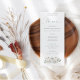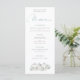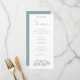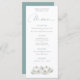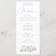 Boda de las calabazas blancas modernas. Tres calabazas con flores blancas y follaje verde azulado están en la parte inferior con un verde azulado de coordinación en la parte posterior, con un elegante guión para Menú y fácil de personalizar el resto del texto a sus necesidades.