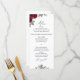 Menú para la celebración boda con nombres de flores y caligrafías de color burdeos y verde.