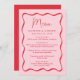 Añada un toque vintage a su fiesta de compromiso, cena de ensayo o recepción de bodas con este moderno menú boda de marco rosado y ondulado rojo. El diseño muestra los nombres de la pareja, la fecha boda y las opciones de menú con letras rojas en negrita rodeadas por un borde de marco ondulado rojo contra un fondo rosado. El menú retro boda coordina con nuestra colección Modern Wavy Frame boda.