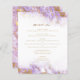 Este elegante y moderno menú boda incluye una capa de mármol de color agua de lavanda recortada con un falso Relieve metalizado de oro. El texto del personalizable combina el guión de color dorado con el tipo de letra serif. El reverso cuenta con lavanda y mármol dorado a juego.