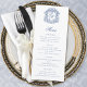 Este elegante menú boda azul presenta un escudo vintage ornamentado en la parte superior con las iniciales en monograma de la novia y el novio con sofisticadas letras formales. Encuentra productos coincidentes en la colección, o envíame un mensaje a través de Zazzle Chat para obtener más productos y ajustes de diseño.