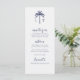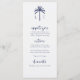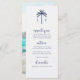 El menú de boda temático junto al mar incluye un monograma de una pareja de palmeras junto con opciones de comida y bebida en la parte delantera, en un texto de la marina náutica oscura sobre un fondo blanco limpio. En el reverso se encuentra una playa tropical acuática, palmeras y olas oceánicas que desembocan en una orilla de arena. Arte por KL Stock