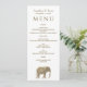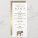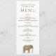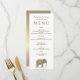 Menú boda blanco sencillo, elegante y minimalista en combinación con elefante monograma de Relieve metalizado dorado, símbolo de amor, fertilidad y buena suerte. Elegante, elegante, único, para novias con un gusto moderno y sofisticado.