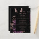 Este elegante y acogedor menú boda propone un exuberante y romántico ramo floral de color violeta con un Relieve metalizado de imitación de oro rosa y follaje purpurina sobre un fondo negro. Personalizar el texto rosa rosa en fuentes elegantes en un rectángulo negro. El dorso de la tarjeta es negro sólido.