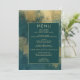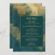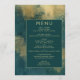Este elegante menú de bodas presenta un fondo moderno de color azul verde azulado y dorado abstracto. Personalizar el texto de color dorado en fuentes elegantes en un rectángulo verde azulado oscuro. La parte posterior del menú repite el diseño abstracto.