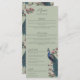 Elegante y completo menú boda de color verde sabio con ilustraciones "Chinoiserie" dibujados a mano de un ave pavo real azul y verde azulado rodeado de vegetación de Magnolia, flores de magnolia crema y rosa, todo ello con un elegante fondo verde salado. La parte posterior presenta un elegante diseño floral y de aves con ilustraciones coordinados. Todo el texto es editable. Personalizar con los detalles de su boda, incluyendo nombres de novios, aperitivos, plato principal, mesa de postres y bebidas.