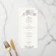 Una elegante y sofisticada pieza de acompañamiento de invitación a la boda formal: la carta del menú, que presenta una caligrafía elegante con delicadas floraciones y un fondo blanco perla, así como un falso acento floral grabado en relieve con estampillas y otras flores de boda y vegetación. Esta carta clásica tradicional y formal de boda es una encantadora elección para parejas que aman el arte, los diseños artísticos, el arte único y original y los diseños formales y tradicionales de los bodas. Personalizar cada línea de texto. Elementos coincidentes disponibles.