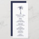 Proporcione a sus huéspedes este diseño de menú tropical boda con escritura moderna, texto azul marino y una palmera artística. En la parte trasera hay un fondo azul marino de coordinación. Póngase en contacto conmigo si necesita ayuda o un pedido de un personalizado.