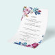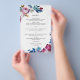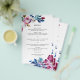 Moderno menú Boda floral con presupuesto floral (impreso en papel de impresora delgado) con peonías y rosas en tonos rosa negrita y vibrante con brotes verdes en tonos verde azulados y azules. La parte trasera está a la sombra de un azul verde azulado. Este luminoso menú Boda con colores de joyas es ideal para un boda de verano.