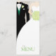 Elegante novia gráfica con velo y sosteniendo un pozo de rosas elegantes y verdes junto a su novio con un chaleco verde y un menú boda de corbata de arco negro. Edite estos menús con sus propias opciones de comida. Hay otros elementos coincidentes disponibles. Diseño único y arte gráfico por Sarah Trett para www.mylittleedenweddings.com