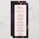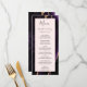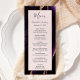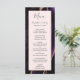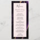 Elegante y moderno menú boda con un fondo acuarela violeta adornado con un purpurina de imitación dorada. El texto aparece en letra elegante de color gris carbón vegetal y fuentes de copperplate en un rectángulo rosa rubor. El diseño de agate se repite al revés.