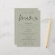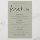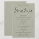 Menú Boda verde suave de guión elegante de presupuesto. Un precio económico de 5,5" x 8,5", en una elegante stock de 110 lb LINEN - para un ambiente de lujo a gran valor, es perfecto para menús, así como invitaciones y programas, etc. Esta alternativa de tamaño de presupuesto también está disponible en otras opciones de papel. El material de la tarjeta SEMI-GLOSS de 110 lb es aproximadamente del mismo grosor que una postal, por lo que también funciona bien para las invitaciones. El papel FELT de 100 libras es de color buff, NO blanco, por lo que añade un toque rústico. El material de papel MATTE 80lb es blanco brillante, para impresión crujiente, ideal para menús y programas, mientras que el papel SATIN de 80 libras es delgado y liviano, ideal para gabinetes. TENGA EN CUENTA QUE LOS ENVELOPES OPCIONALES SON UN POCO MÁS GRANDES DE TAMAÑO A 6,75" x 9" aprox. Un diseño tipográfico elegante con un guión conjunto de estilo de escritura a mano para el menú de cabecera. Personaliza fácilmente el resto del texto a tus propios detalles, que incluyen espacio para tus opciones veganas o vegetarianas. También puede cambiar estilos de texto y colores, así como los colores de fondo a través de la opción personalizar adicional si lo desea.