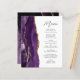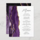 En el extremo izquierdo de este elegante y moderno menú boda, un juego de acuarelas violetas adornado con un falso purpurina dorado. El texto del personalizable combina el guión de escritura a mano gris carbón y sans serif en un fondo blanco. El diseño de la agata morada y dorada se repite al revés.