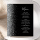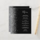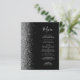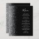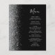 En el extremo izquierdo de este elegante y moderno menú boda se encuentra el purpurina falso plateado. El texto del personalizable combina el guión de escritura a mano gris plateado y los tipos de letra de copperplate en un fondo negro. El reverso presenta un diseño negro y plateado a juego.