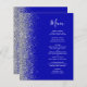 En el extremo izquierdo de este elegante y moderno menú boda se encuentra el purpurina falso plateado. El texto de personalizable combina guiones de escritura a mano en blanco y fuentes de copperplate en un fondo azul real. En el reverso se aprecia un diseño que combina el azul real con el plateado.