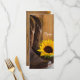 Personalizar el bonito Country Sunflower Boda Menu con los detalles de la comida que se servirán en su granja rural o en su casa de campo estilo rancho fiesta de granero, ducha de novia o recepción matrimonial añadiendo la ensalada o primer curso, entrante o segundo y postre o tercer curso. La encantadora carta personalizado-rústica boda incluye una pintoresca fotografía floral de una flor de girasol amarilla, botas de vaquero de cuero marrón y madera de granero templado.