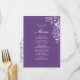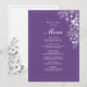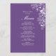 Eleva la decoración de tu mesa de recepción con esta elegante tarjeta de menú de boda morada con delicado arte de línea de flores blancas, tipografía de letra cursiva refinada y un diseño minimalista moderno. Perfecta para celebraciones románticas, de primavera o formales, este menú coordina con el conjunto completo de la suite de boda de Bianca & Maxim. La parte trasera incluye un marco floral a juego para detalles adicionales o notas. Ideal para bodas, cenas de ensayo o eventos especiales.