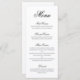 Elegante y clásico menú boda con un diseño sencillo con "menú" y las cabeceras de los cursos en una caligrafía negra formal y descripciones de los cursos en una fuente serif sobre un fondo blanco. Un diseño tradicional y elegante, perfecto para un boda de corbata negra.