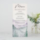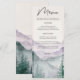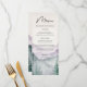 Presente su comida de boda con estilo con este elegante menú inspirado en la naturaleza. El hermoso diseño de acuarela presenta un paisaje de montaña y bosque brumoso, creando un sofisticado fondo para sus selecciones culinarias. Personalice fácilmente el menú con sus platos elegidos. Un complemento perfecto para su tema de boda rústica o al aire libre.