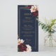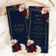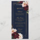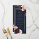 Personalice esta elegante tarjeta de menú delgado para bodas de manera fácil y rápida. Simplemente haga clic en el botón Editar usando herramientas de diseño para editar el texto, cambiar las fuentes y los colores de las fuentes. Cuenta con hermosas flores de peonía de color burgundy y rosa pálido realistas sobre un fondo azul marino oscuro. Artículos coincidentes disponibles en la tienda. (c) Somerset Fine Paperie