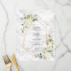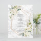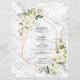 Moderno y a la última, la carta boda se caracteriza por su montaje floral de color acuarela, florido de color blanco y de eucalipto, y por su textura de mármol blanco. Copyright Elegant Invita. Todos Los Derechos Reservados.